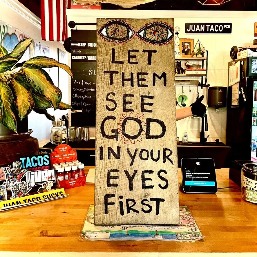A wooden sign on a restaurant counter with hand-painted eyes at the top and the message "LET THEM SEE GOD IN YOUR EYES FIRST" written below. The background includes a plant, a menu board, and kitchen items.