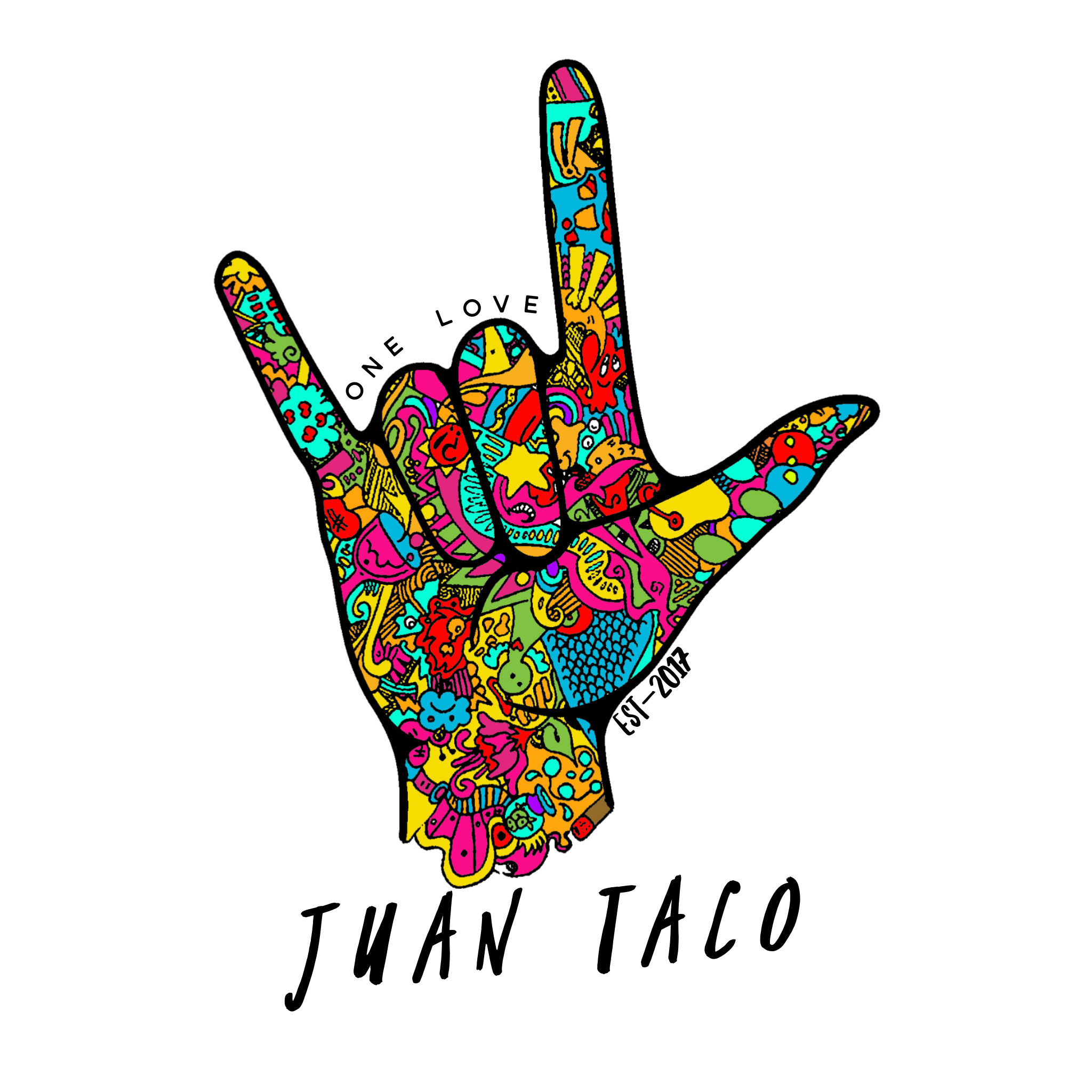 A colorful, doodle-style illustration of a hand making the rock and roll gesture, with the words 'ONE LOVE' in the middle of the fingers, and 'JUAN TACO' below. The hand is filled with various vibrant patterns and characters.